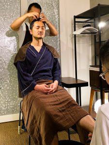 ※ガルシャナ(絹手袋を使って身体を軽擦し、その後に行われるアビヤンガの効果を高める施術)